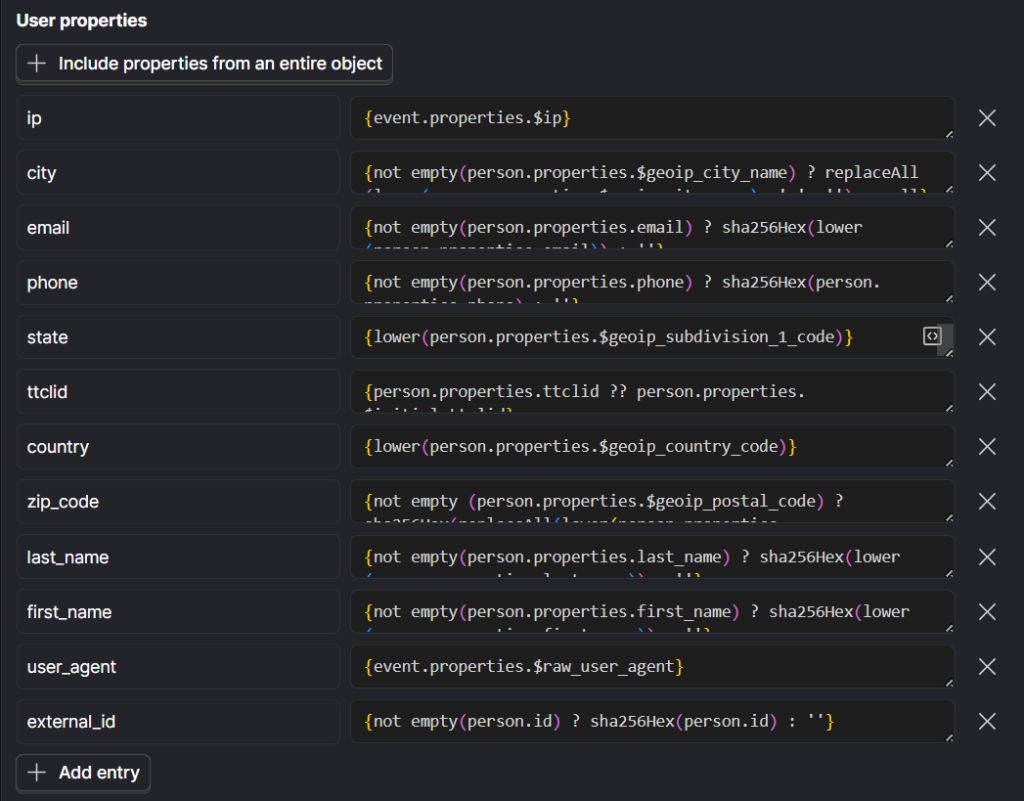 zip_code: For web events, this field is commonly mapped from {not empty(person.properties.$geoip_postal_code) ? sha256Hex(replaceAll(lower(person.properties.$geoip_postal_code), ' ', '')) : null} and represents the customer’s ZIP code or postal code.