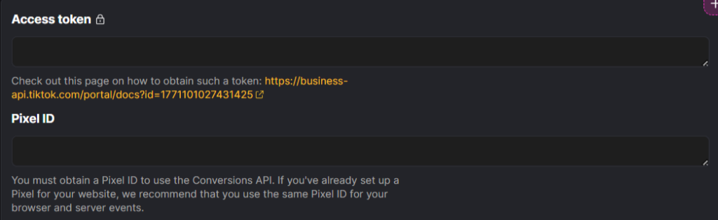 Next, connect your TikTok Ads account to PostHog. You will need two values for this step: your Pixel ID, which tells PostHog where the events should be sent, and your Access Token, which authorizes the connection with TikTok Ads.