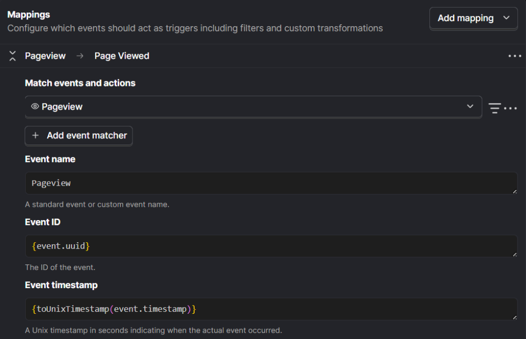 Event timestamp: Use the timestamp that reflects when the event actually happened. If you have a custom event time available, map that here. If not, the default value {toUnixTimestamp(event.timestamp)} is usually sufficient.