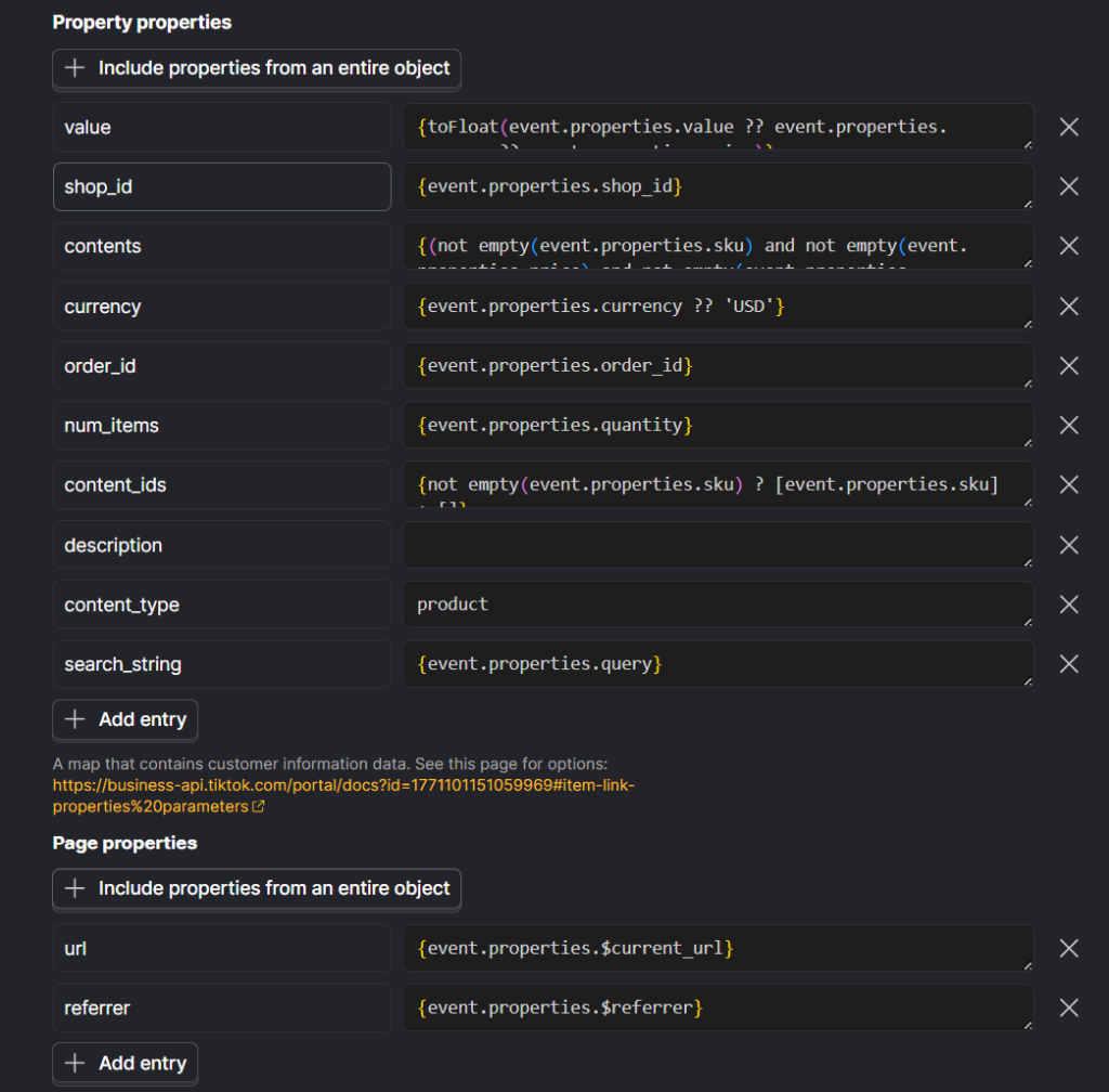 This is where you define which PostHog events should be sent to TikTok Ads. PostHog provides a default mapping template to help you get started, but it should be adjusted to reflect your own event structure and conversion logic.