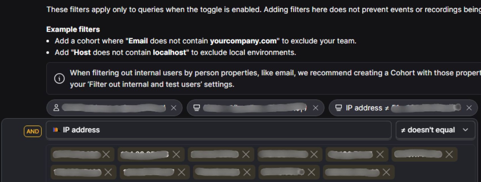 PostHog supports multiple rules at once, helping you build a comprehensive internal user exclusion filter. Combine filters like IP address + email domain for better accuracy.