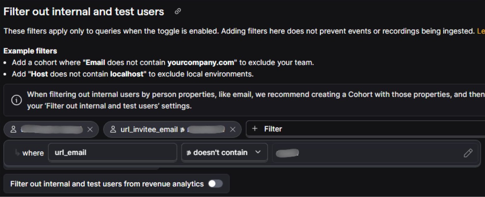 Then apply those cohorts or person properties in “Filter out internal and test users” so internal people are excluded regardless of where they’re connecting from. (+)